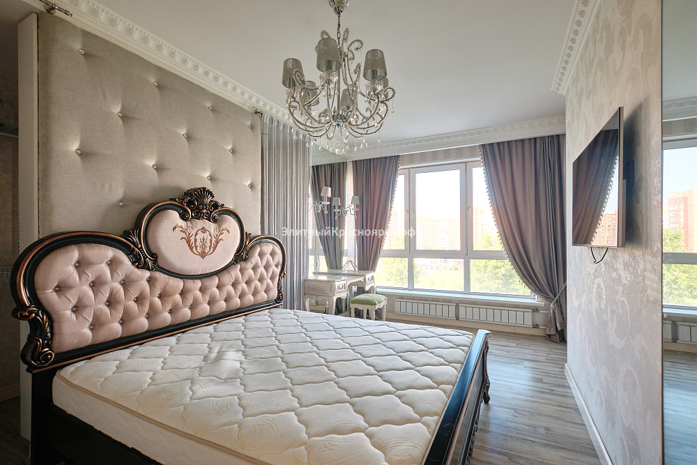 Светлая просторная квартира состоит из вместительной кухни и двух отдельных спален, а также большой ванной комнаты и удобной гардеробной.