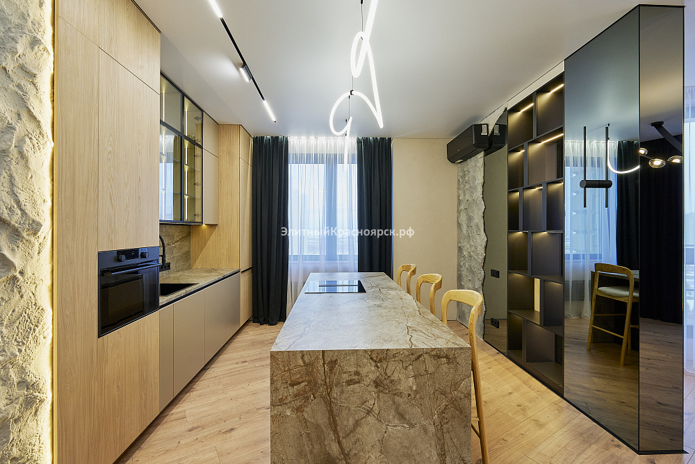 - просторная кухня-гостиная с каменным островом и большими окнами – место, где приятно собираться всей семьей;