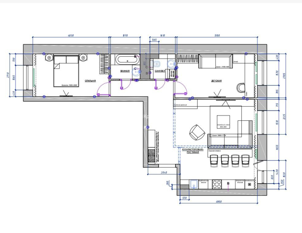 - объединенная кухня-гостиная;